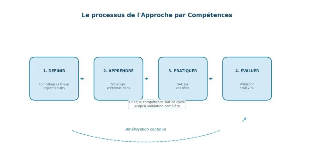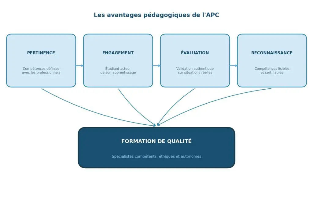 Enfin, l’APC facilite la mobilité et la reconnaissance des compétences. Le référentiel de formation par compétences constitue une charte transparente des attentes, lisible par les employeurs, les partenaires institutionnels et les instances de certification.